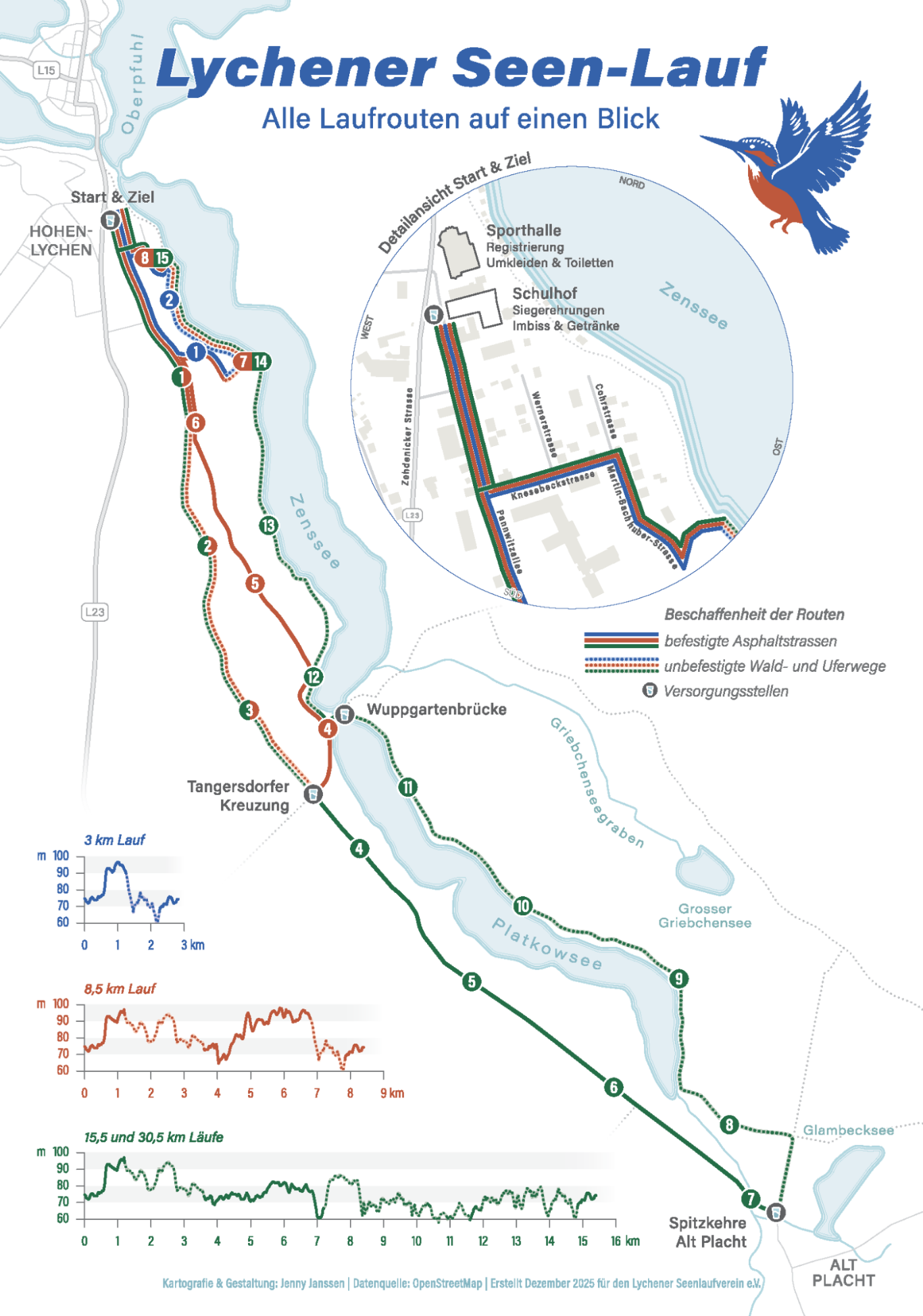 Nach 200 m asphaltiertem Fahrradweg führt die Laufstrecke rechts am Ufer des Zenssees auf einem schmalen Waldpfad entlang. Durch Bäume und Wurzeln, sowie Engstellen, ist hohe Konzentration der Läufer gefordert. An der Badestelle Sängerslust vereinen sich alle Strecken. Durch das ehemalige Heilstättengelände erreichen Sie das Ziel(15,5km), während die Läufer der 30,5km die Strecke bei(15,25km) erneut laufen.
